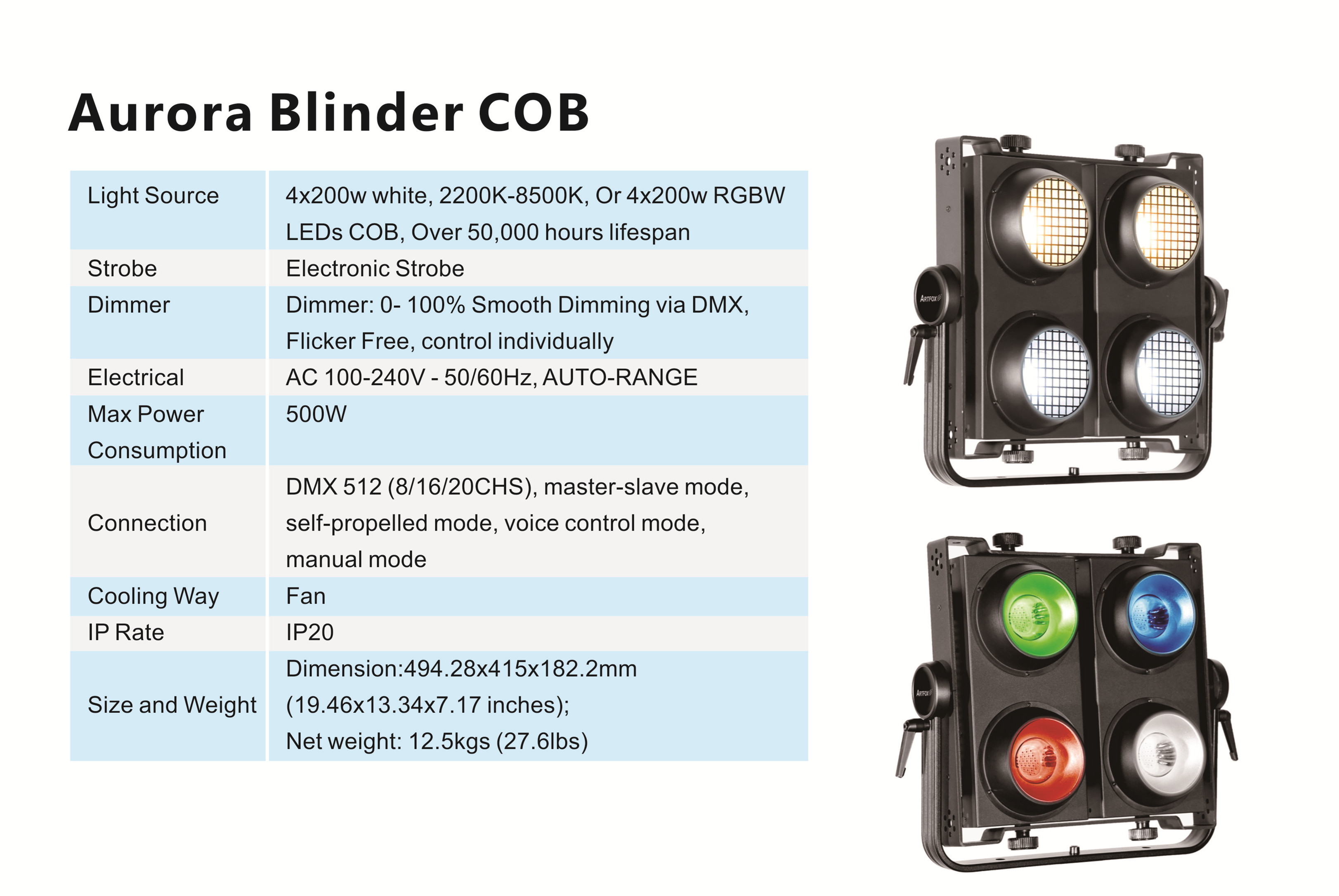 Aurora COB Blinder brings all the advantages of COB into studio and stage Lighting. It Features a 4x200W LED, COB, 2200K-8500K, It is powerful for outdoor events and big concert, comparing with traditional blinder lights, It is more powerful but energy saving.Features: